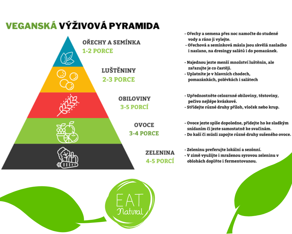 Komplexní sacharidy i dostatek bílkovin zajišťují luštěniny (hrách, čočka, fazole, cizrna, sója) a výrobky z nich (tofu, tempeh…). Bílkoviny obsahují v dalším patře také ořechy a semena, které jsou i zdrojem zdravých tuků včetně pro tělo nezbytných vícenenasycených mastných kyselin. Pyramidu pak na její špičce uzavírají různé doplňky (např. mořské řasy, lahůdkové droždí, popř. tablety některých nepostradatelných vitaminů, o kterých píšu níže).