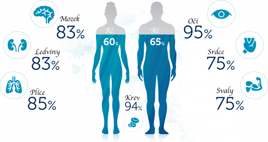 Náš lidský organismus je totiž tvořen z více než 70% právě vodou, která se podílí na všech důležitých procesech v těle. Voda působí jako přepravce živin, “mazivo” pro klouby a vnitřní orgány, reguluje tělesnou teplotu, poskytuje strukturu buňkám, tkáním a přispívá ke správnému průběhu chemických a metabolických reakcí.
